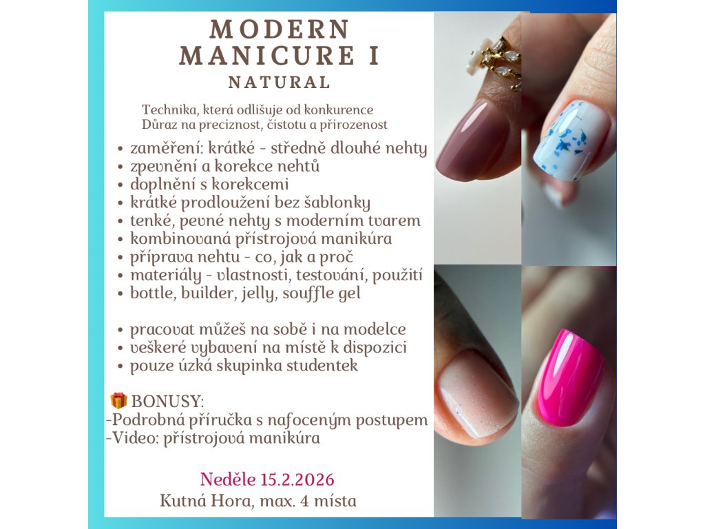 Zaměříme se na práci s přírodním nehtem bez šablon - gelovou modeláž, zpevnění a korekci i bez prodloužení, ale i na správné doplnění s korekcemi, tak aby byly nehty tenké, pevné a s moderním tvarem každou návštěvu klientky, ne jen při první.